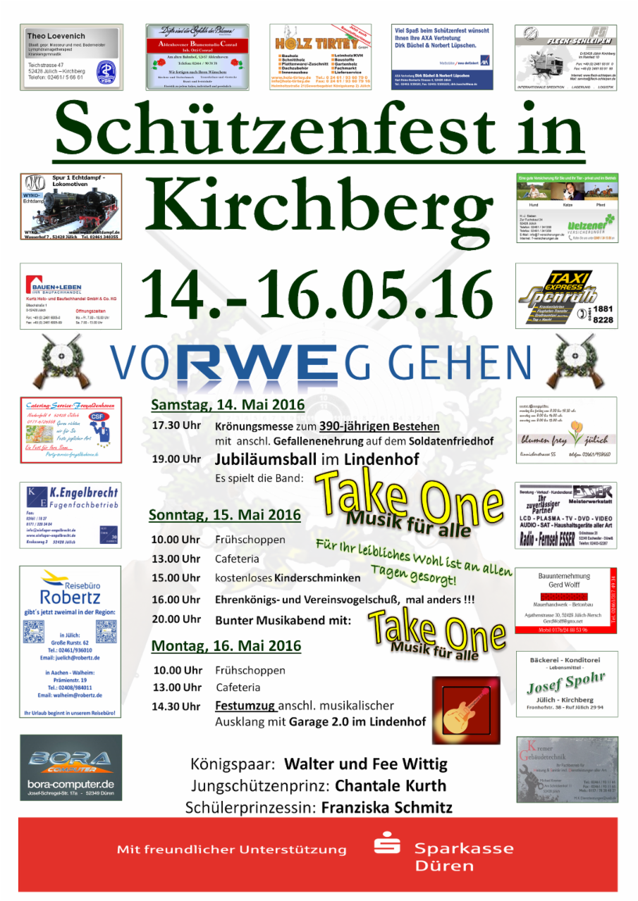 2016 haben wir auf dem Dorfplatz ein tolles Schützenfest gefeiert. Auf 390 Jahre Sakramentsbruderschaft Kirchberg durften wir zurückblicken. Ein großes "Dankeschön" an unsere Majestäten, unser Königspaar Walter und Felicitas (Fee) Wittig unsere Jungschützenprinzessin Chantale Kurth und an unsere Schülerprinzessin Franziska (Franzi) Schmitz. Mit drei Majestäten waren wir für das Fest bestens gerüstet.
